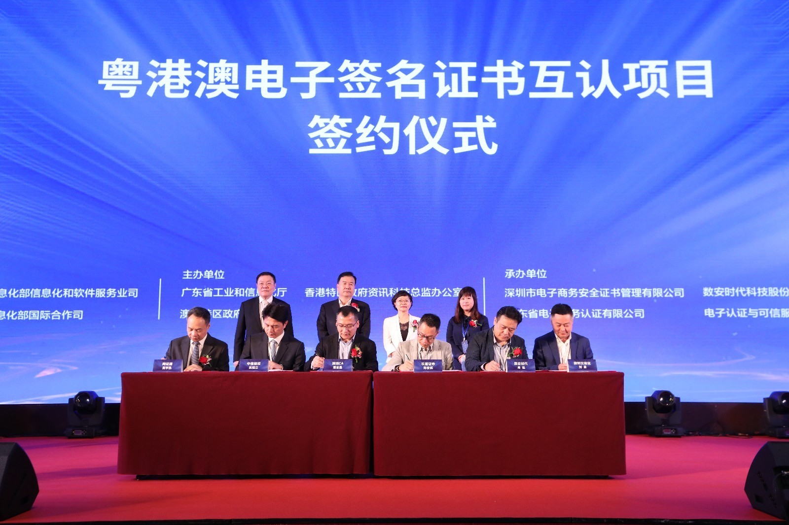 2019年1115日,粵港澳大灣區電子簽名證書互認工作組成立大會暨電子認證發展論壇在深圳成功舉辦。大會認真貫徹落實習近平總書記重要批示精神和《粵港澳大灣區發展規劃綱要》要求,以“智聯互認,無界灣區”為主題,探討電子簽名在金融、公共服務及商貿等領域發展應用。本次大會在工信部信息化和軟件服務業司和工信部國際合作司指導下,由廣東省工業和信息化廳、香港特區政府資訊科技總監辦公室和澳門特區政府郵電局主辦、廣東省電子商務認證有限公司(簡稱:“網證通NETCA”)等機構具體承辦。