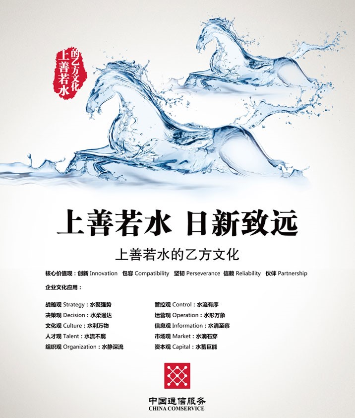 中國通信服務(wù)將水的至善品格融入到公司文化及經(jīng)營發(fā)展當(dāng)中:以 "重信賴、尚智慧、利萬物" 文化內(nèi)涵和 "創(chuàng)新、包容、堅(jiān)韌、信賴、伙伴" 的文化品格,在信息化領(lǐng)域中通過打造一體化的總承包服務(wù)能力,向客戶提供綜合信息網(wǎng)絡(luò)建設(shè)解決方案,從而整體實(shí)現(xiàn)股東、員工、行業(yè)、客戶和社會(huì)的價(jià)值,以幫助別人贏得自己成功。
