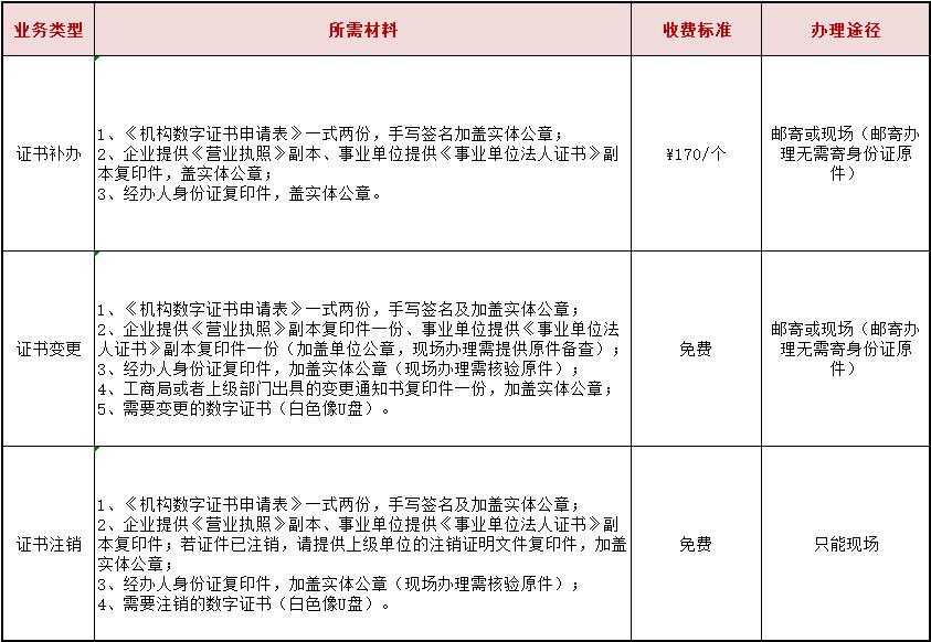 所需材料: 1、《數字證書及電子印章申請表》一式兩份,手寫簽名加蓋單位實體公章 2、經辦人身份證原件 3、需要續期的數字證書 |