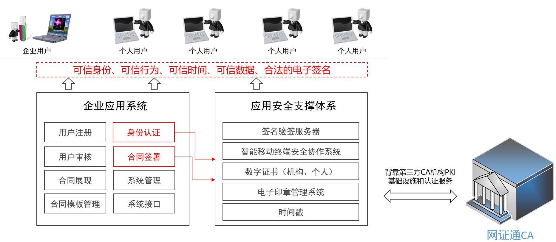 網證通緊緊圍繞電子合同用戶對身份真實性、電子合同安全性、簡單易用性、合法有效性四大核心需求,依托互聯網以 CA 認證和電子簽章為主,時間戳服務為輔,打造證據鏈嚴謹的,符合國家相關法律要求的電子合同安全簽署解決方案。