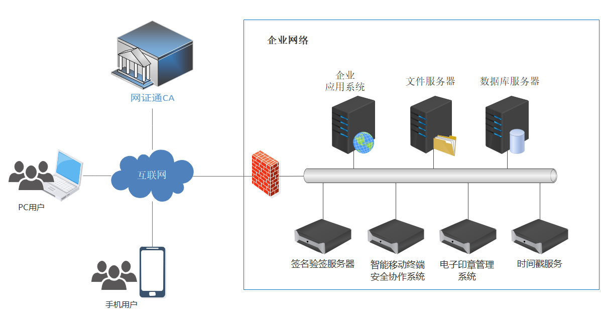 根據電子合同簽訂的應用場景,在企業應用系統所在網絡中部署簽名驗簽服務器、智能移動終端安全協作系統、電子印章管理系統、時間戳服務等設備;通過網絡連接網證通CA中心,網證通CA中心提供可信時間戳服務和電子憑證服務;在應用系統中集成PKI安全中間件;在PC客戶端或移動客戶端安全相應的網證通安全客戶端軟件,再適配相應的數字證書,就完成整個方案的部署。